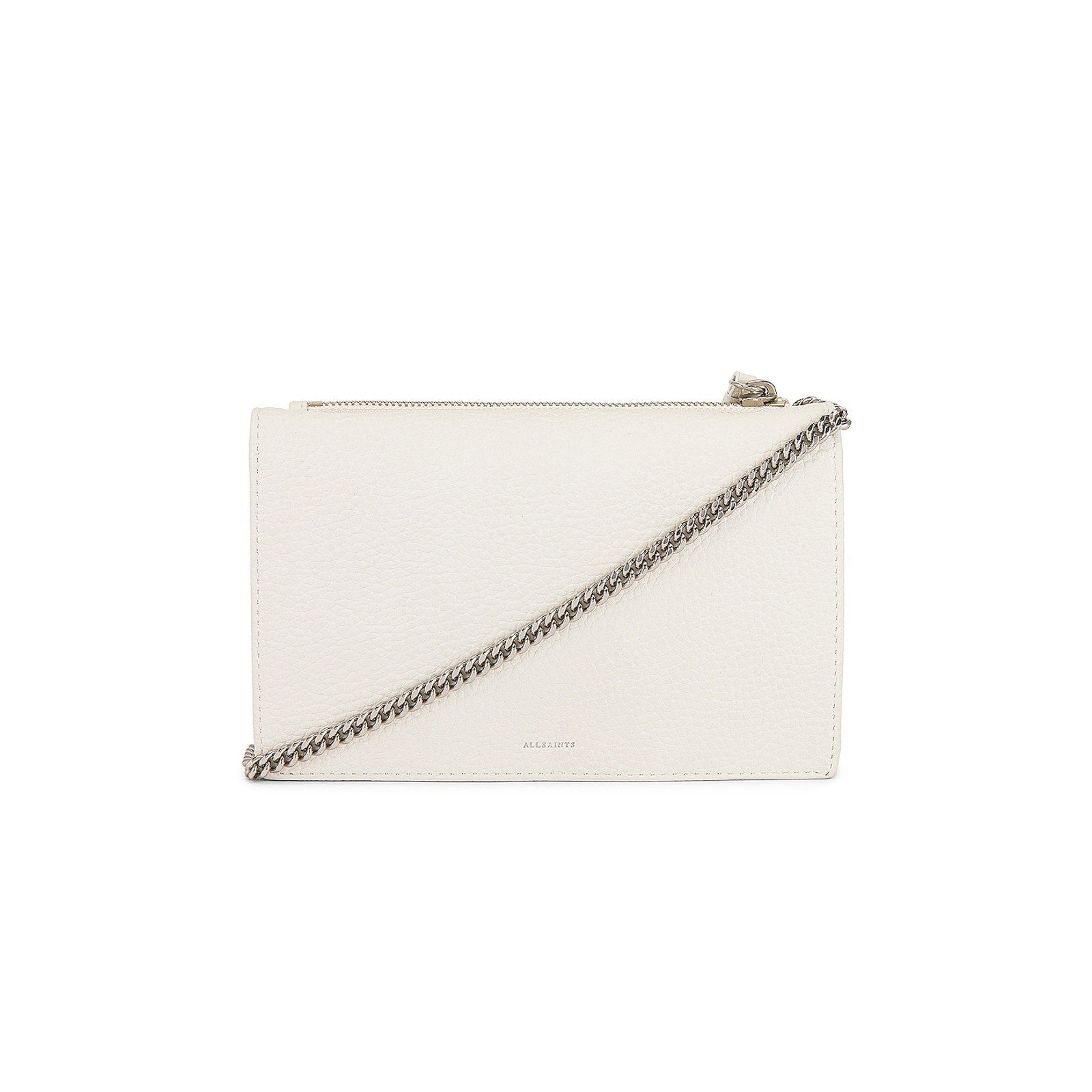 Allsaints 'Fetch' White Chain Crossbody Wallet: pebbled leather exterior with twill lining and polished silver-tone hardware, fold-over flap top closure with snap button fastening, back zip pocket and slip pocket, interior zip pocket, slot pocket and eight interior card slots.