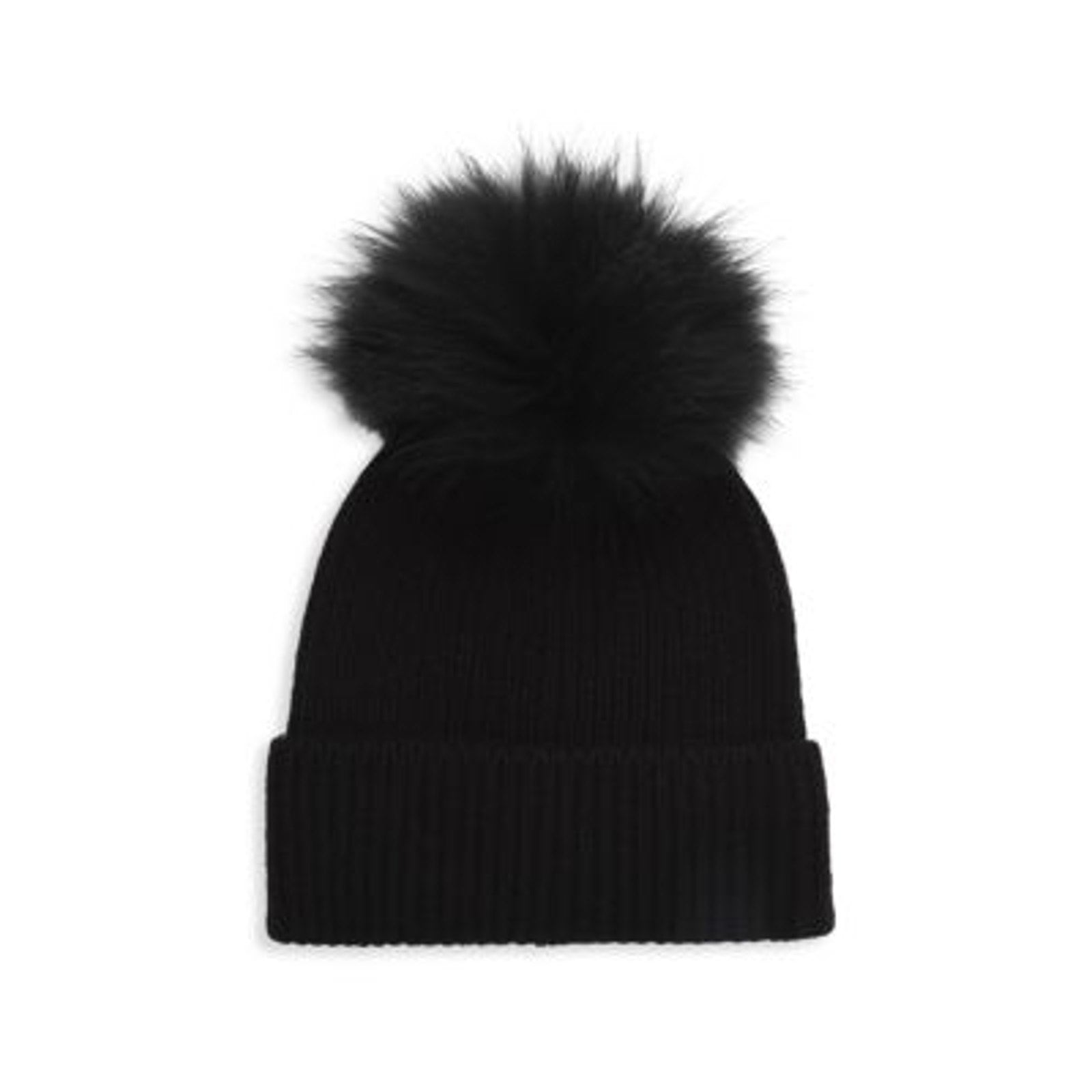 Amicale Cashmere & Fox Fur Black Pom-Pom Beanie Size OS: cashmere & fox fur pom-pom beanie.