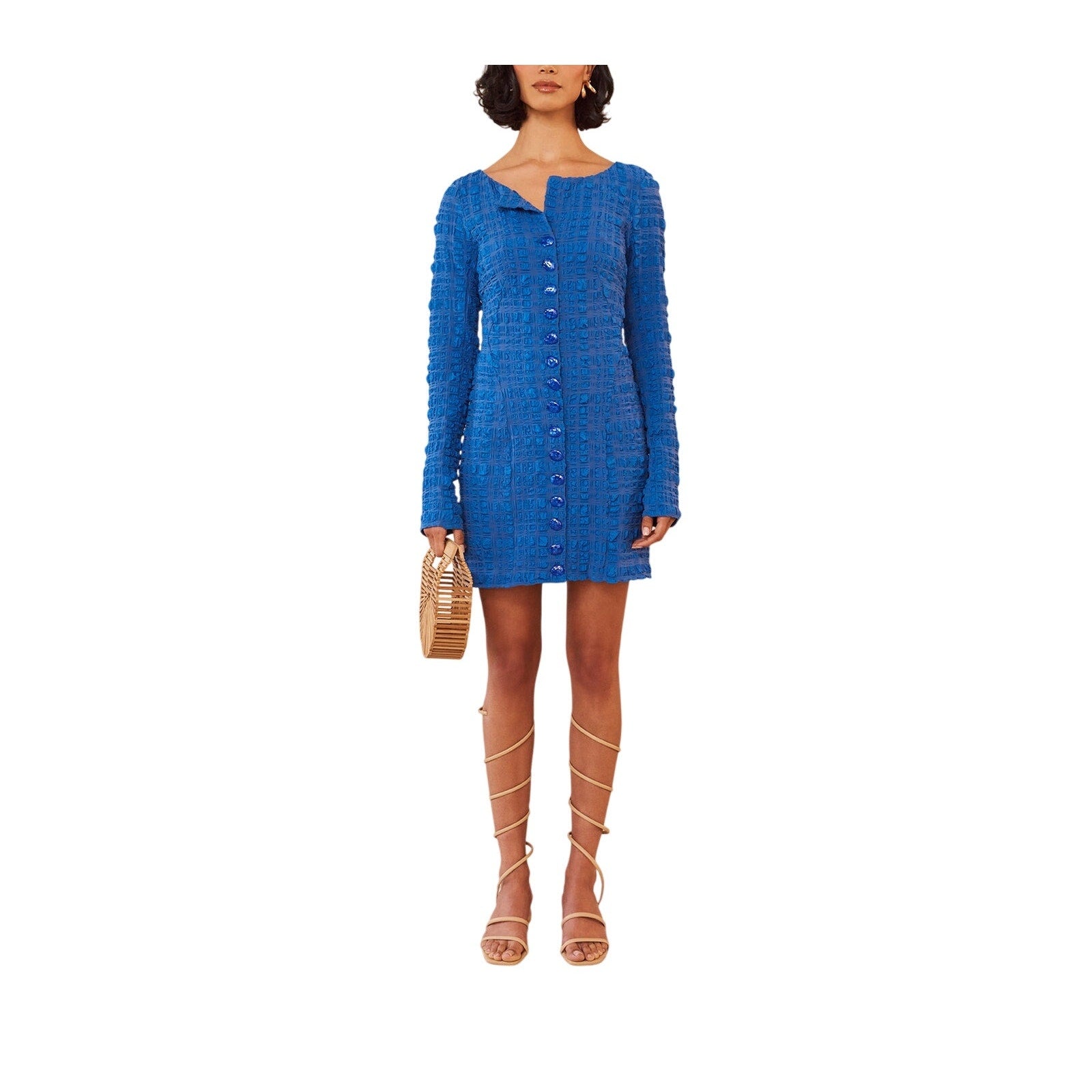 Cult Gaia 'Lafina' Blue Polyester Dress Size XS: long sleeve, textured popcorn fabrication, featuring a hammered brass buttoned up front, mini-length silhouette, measurements: 16 inch bust x 31.5 inch length.