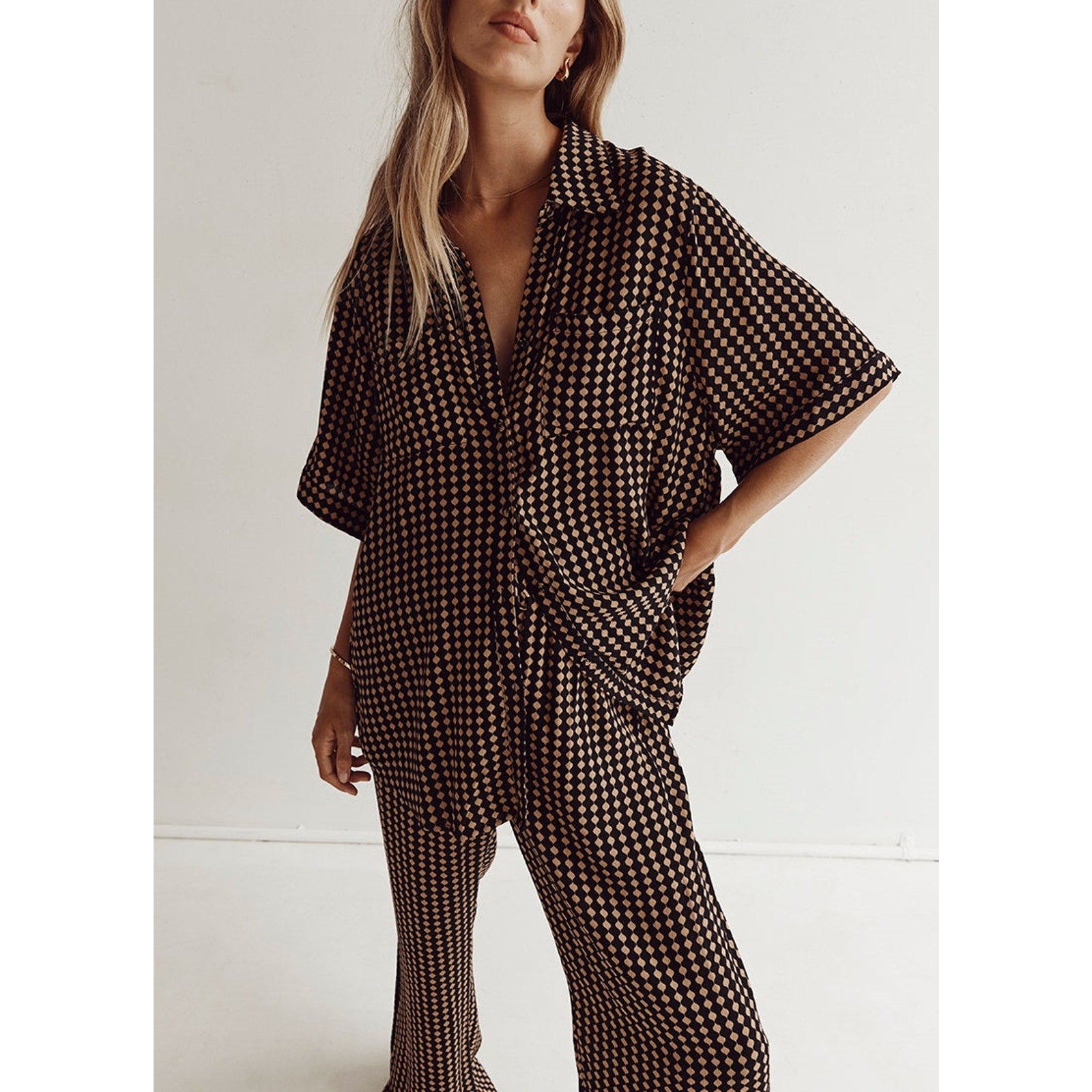 Dissh 'Mila' Black Viscose Caramel Vacation Shirt Size 8: lightweight, non-stretch pure viscose fabrication, oversized fit, short sleeves, functional front pockets, front button closure, full length, unlined, measurements: 17 inch bust x 28 inch length.