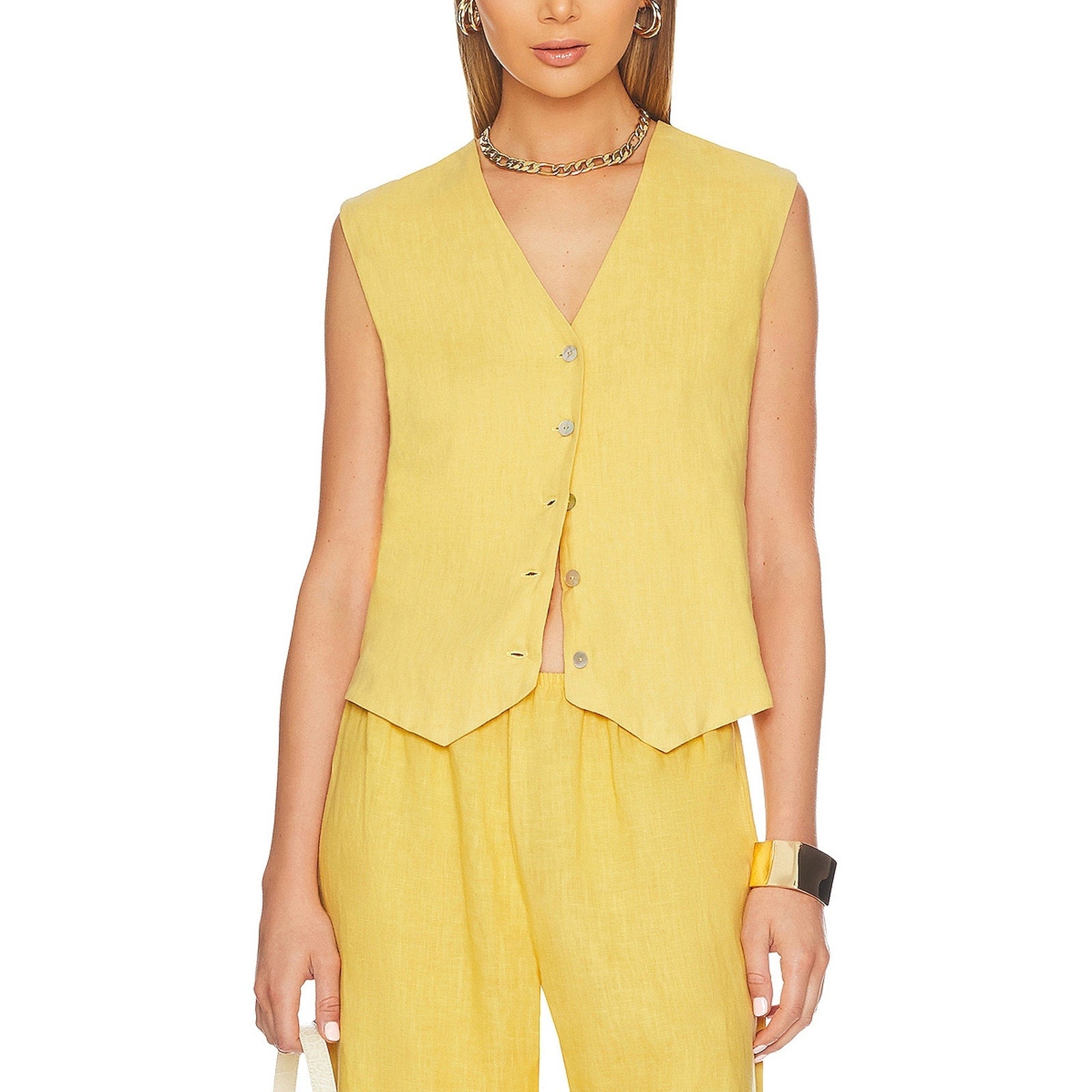 Donni. Yellow Linen Vest Size S: front button closure, lightweight linen fabric with back vent, measurements: 17.5 inch bust x 22 inch length.