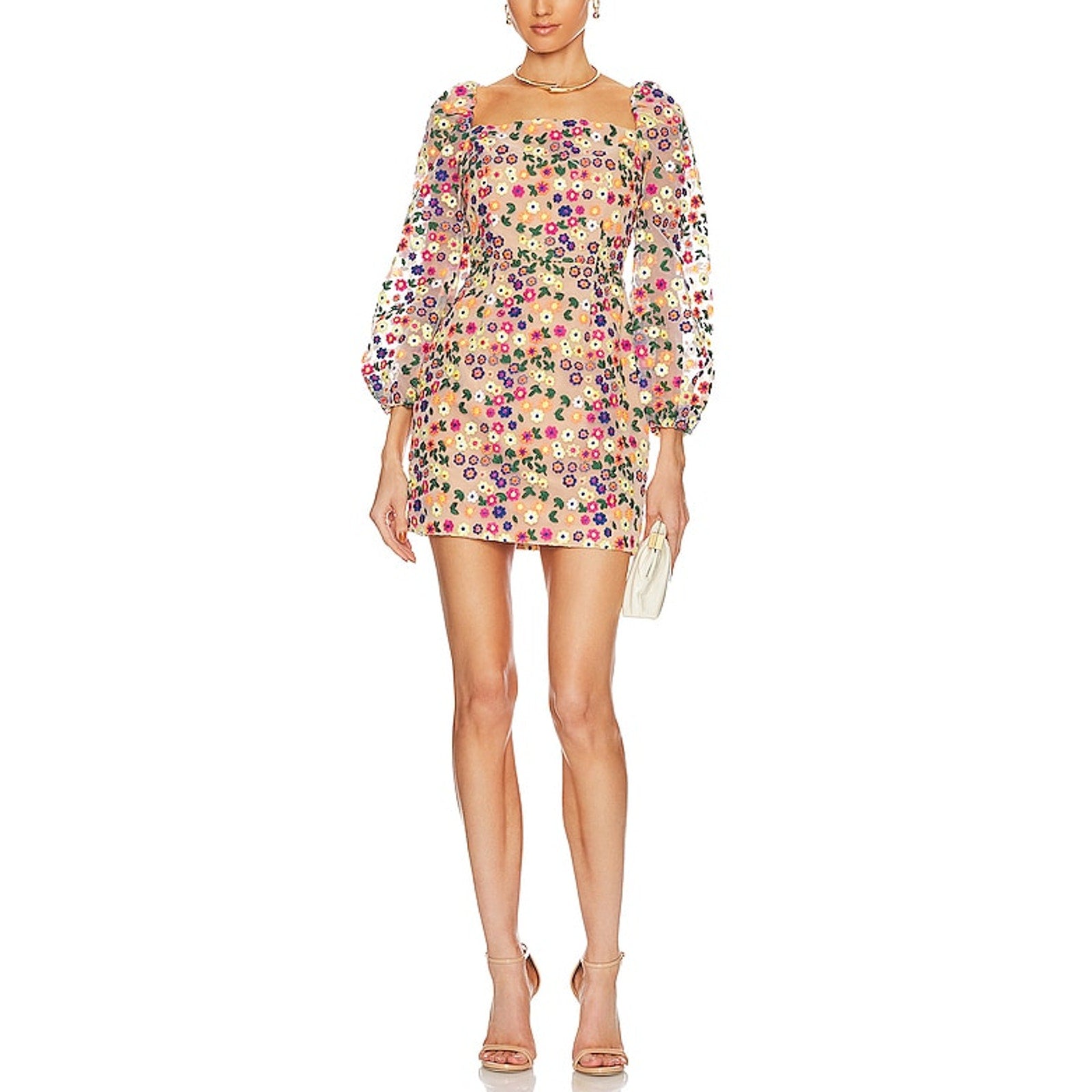Elliatt 'Classical' Pink Polyamide Dress Size XL: fully lined, hidden back zipper closure, sheer blouson sleeves with elastic cuffs, sheer tulle fabric with stitched floral designs throughout, measurements: 18.5 inch bust x 33.5 inch length.