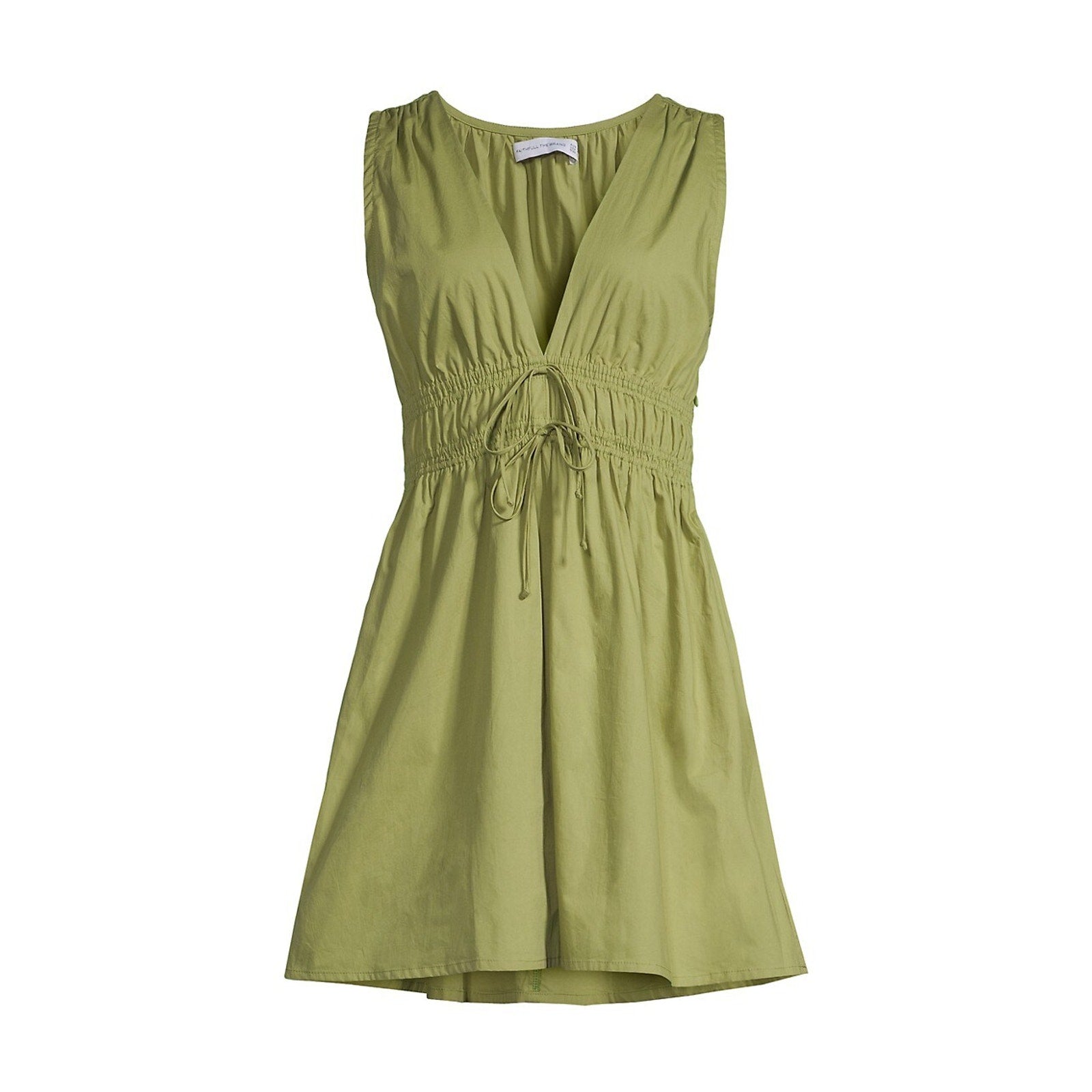 Faithfull The Brand Green Cotton San Michele Mini Dress Size L: unlined, hidden side zipper closure, smocked bodice with front tie accidents, crisp poplin fabric, measurements: 14 inch bust x 32 inch length.