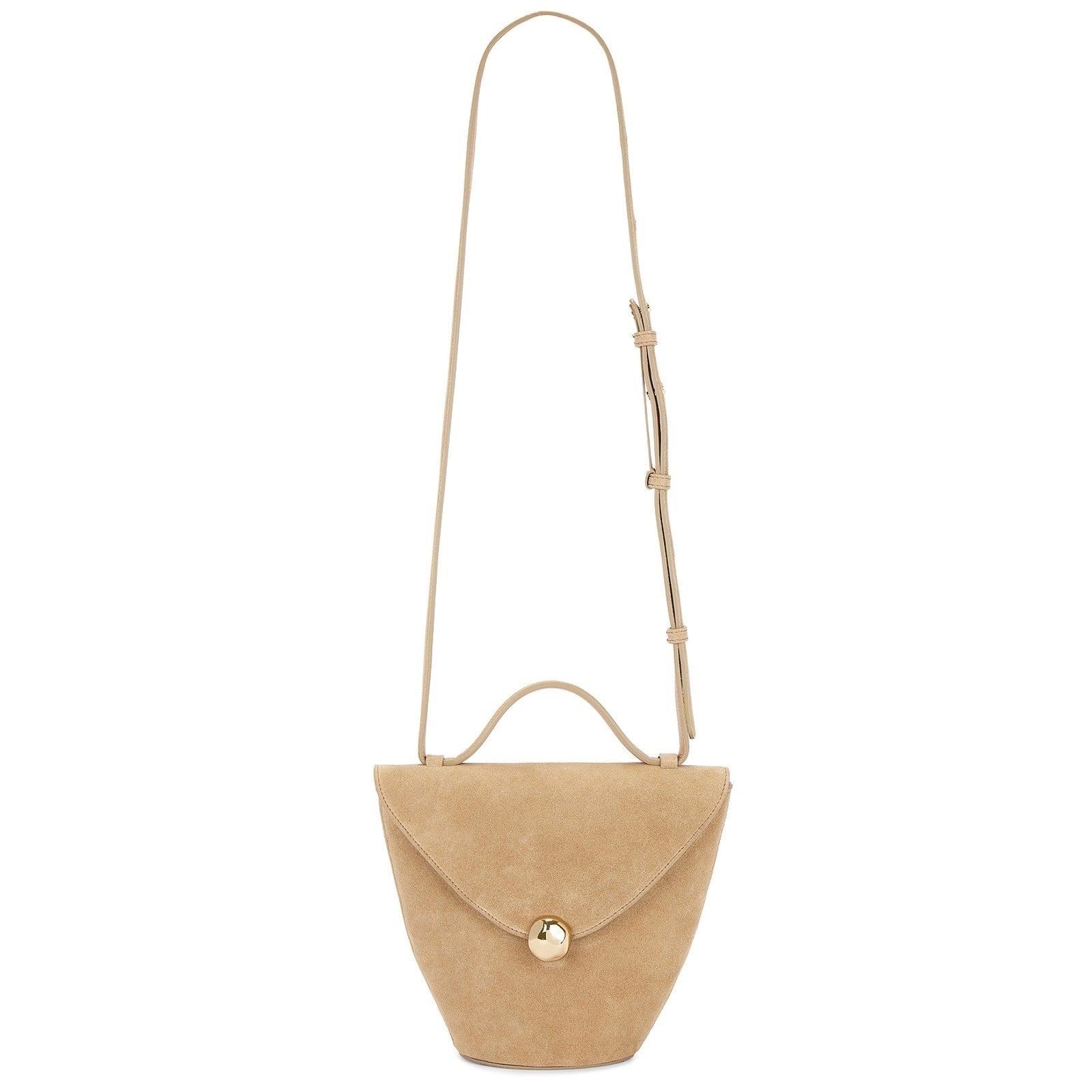 Flattered 'Evelina' Cream Suede Bag: suede exterior with canvas lining, magnetic flap closure, one main compartment, one interior slip pocket, adjustable shoulder strap.
