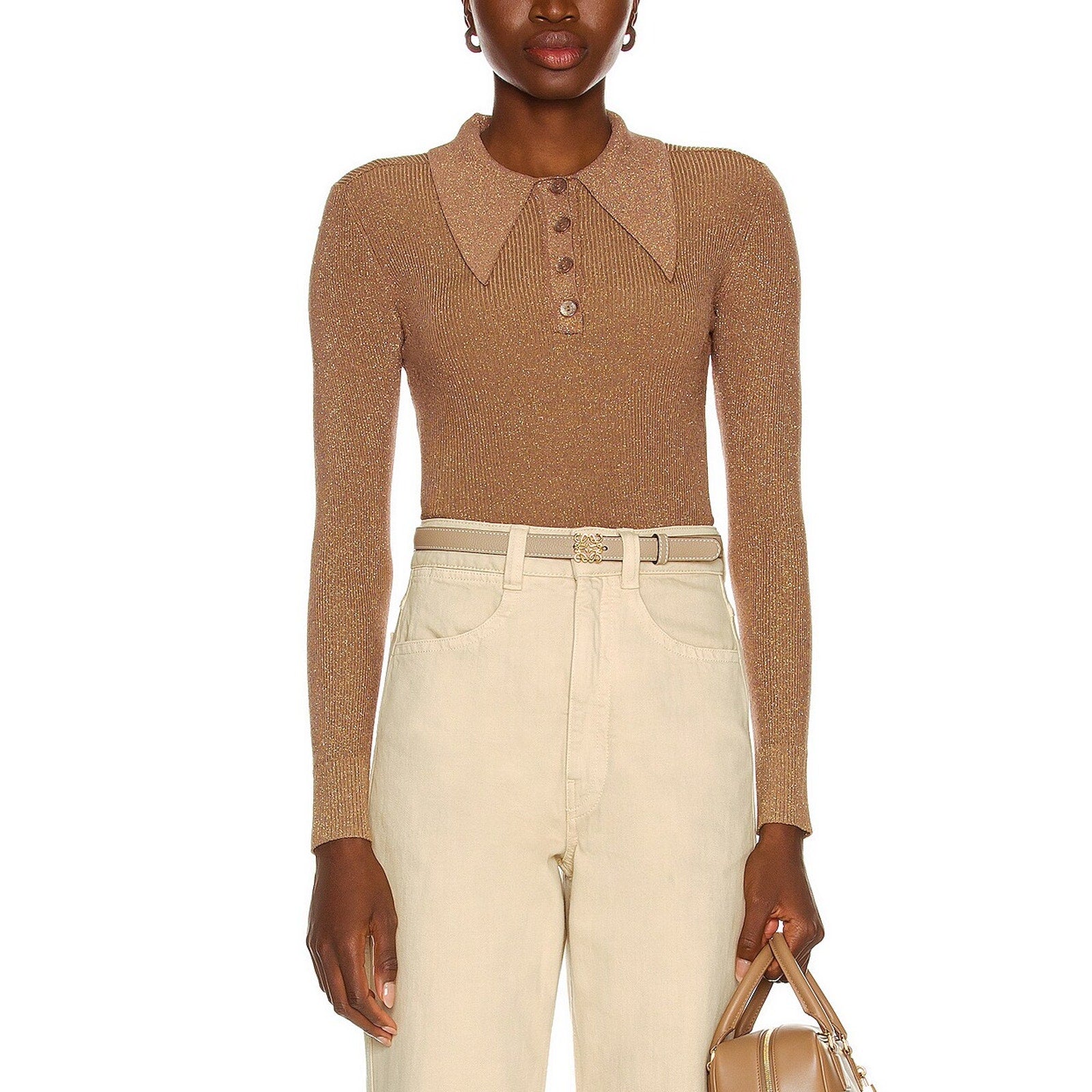Joostricot Long Sleeve Brown Viscose Polo Sweater Size S: partial front button closure, extended collar, stretch ribbed metallic knit.