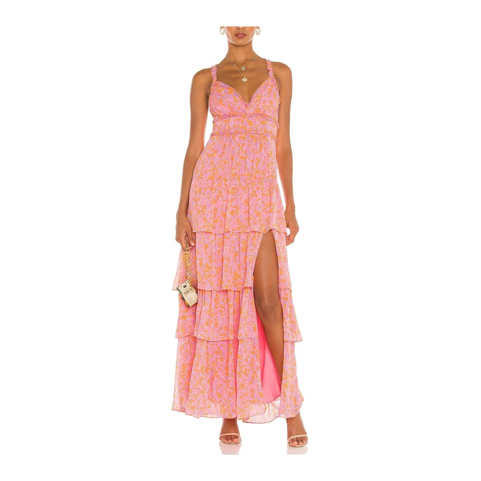 Likely 'Athena' Pink Poly Maxi Dress Size 4: fully lined, hidden back zipper closure, tiered ruffle hem with side slit detail, georgette fabric.