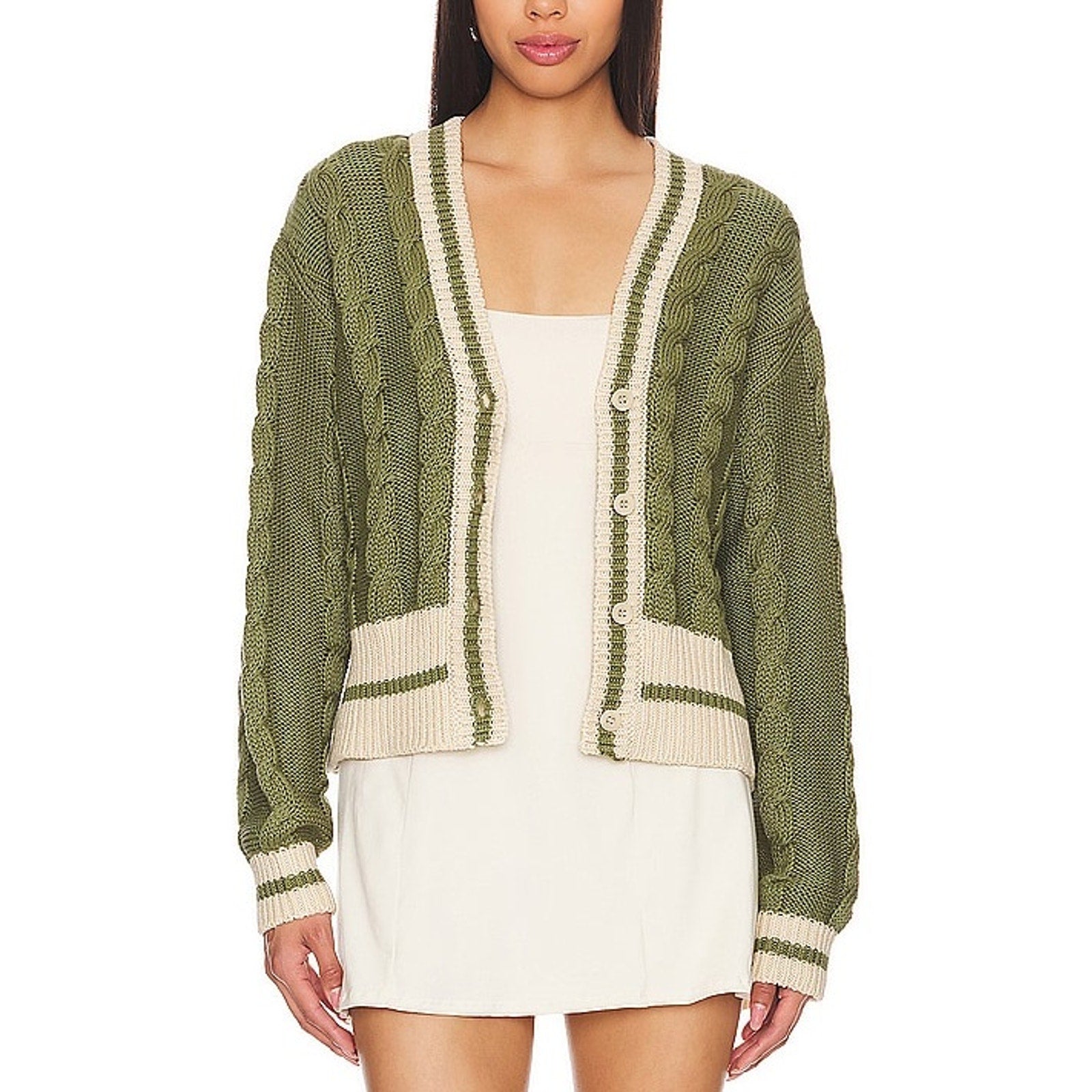 Lspace 'Hampton' Green Sweater Size XS: front button closure, midweight cable knit fabric.
