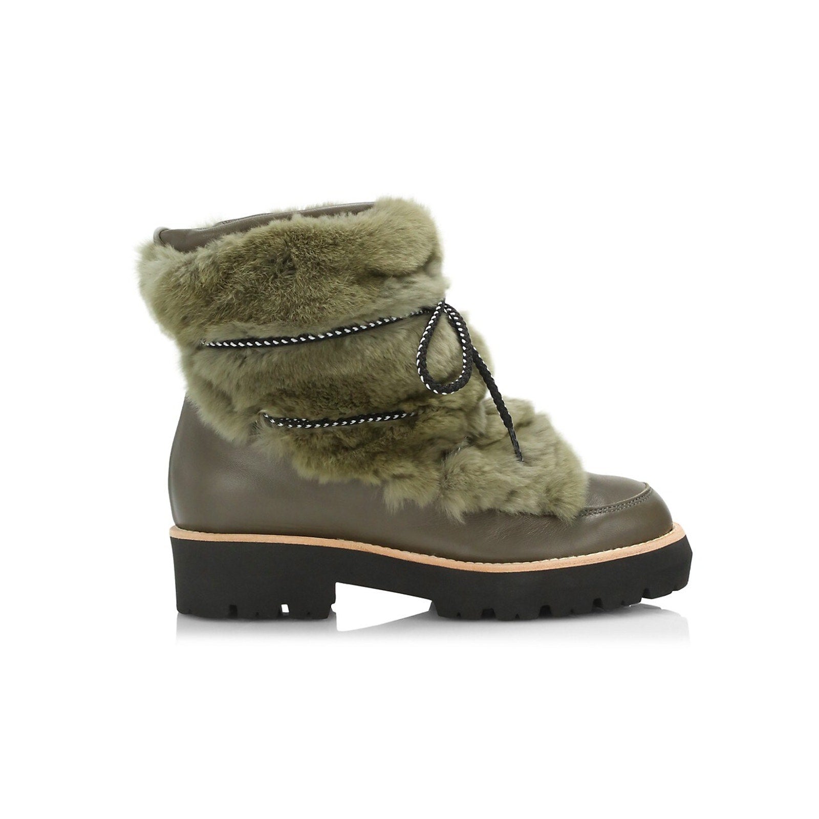 Montelliana 'Jolie' Green Leather Fur Booties Size 9 US / EU 39: leather upper pull-on style and wraparound laces trim rabbit fur padded insole eva sole fur type dyed rabbit fur fur, block heel, shaft height.