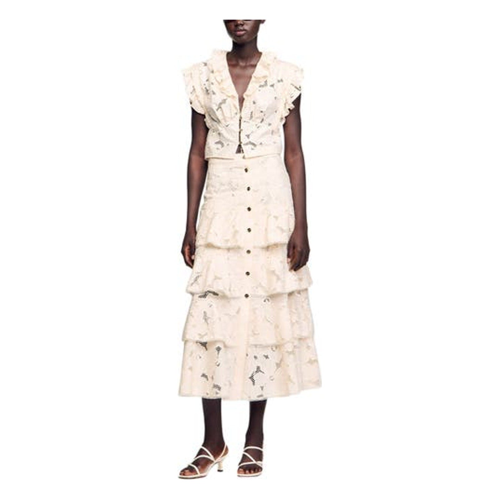 Sandro 'Embroidered' Beige Polyester Crop Top Size 1: v-neck, short ruffled sleeves, button placket on front.