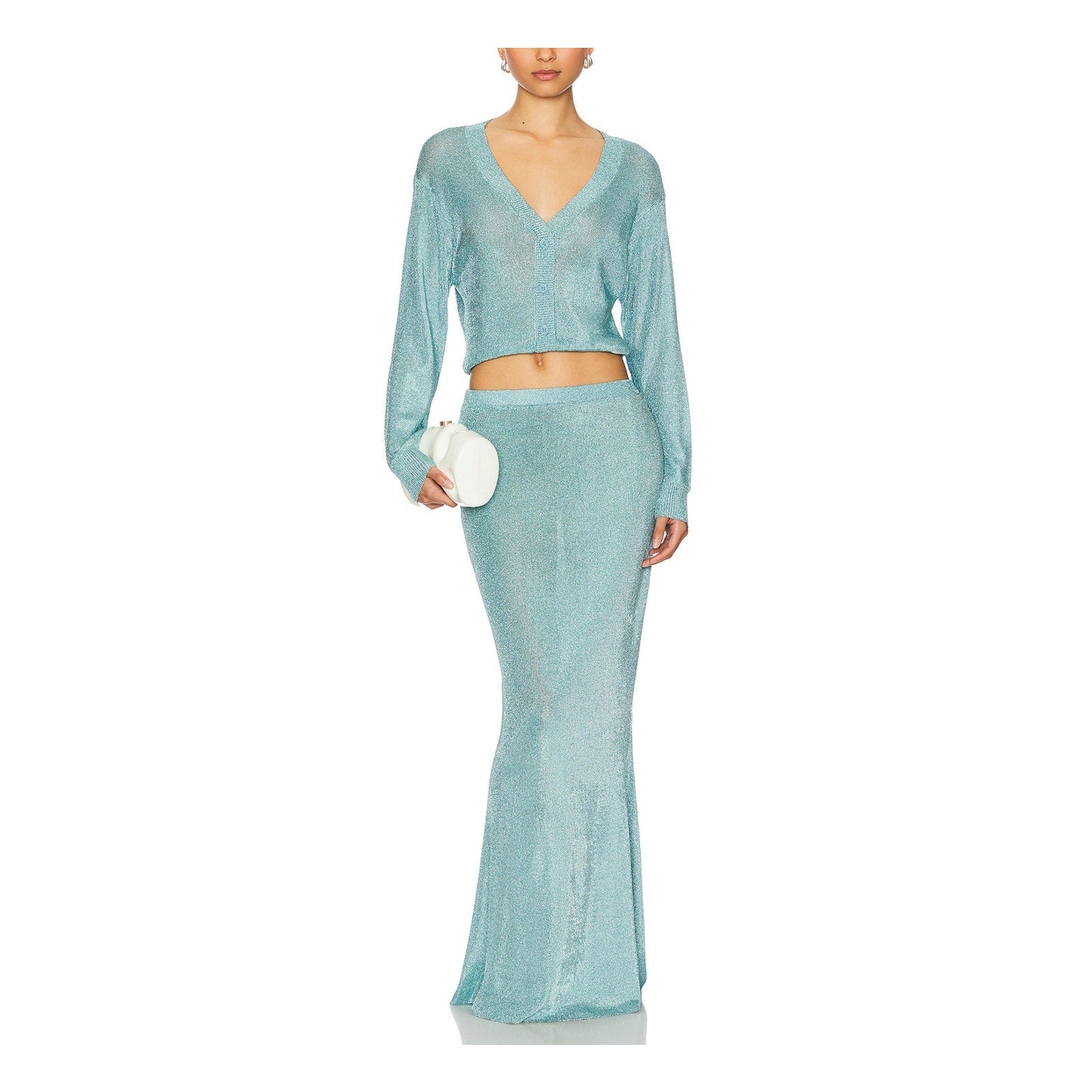 Ser.O.Ya 'Moni' Blue Viscose Metallic Cardigan Top Size S: front button closures, ribbed trim, cropped styling, midweight semi-sheer metallic knit fabric, measurements: 16.5 inch bust x 18 inch length.
