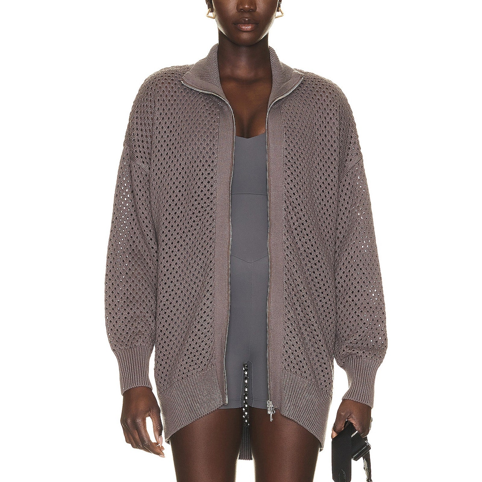 Varley 'Cassady' Grey Cotton Knit Jacket Size XS: front zipper closure, perforated knit fabric with ribbed edges, measurements: 21 inch bust width x 29 inch length, thread pull on left side below the arm.