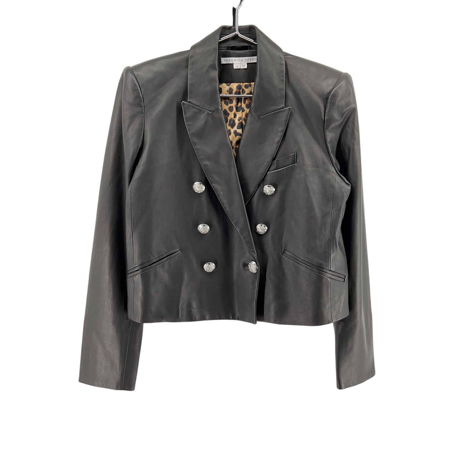 Veronica Beard 'Nevis' Black Leather Jacket Size 12: long sleeves with button cuffs, peak lapel, double-breasted, metal crest buttons, slit slant pockets, cropped, boxy silhouette, lined, measurements: 19 inch bust width x 22 inch center back length x 25 inch sleeve length, two faint white marks on front right shoulder, faint scratch in the leather on the front right side near the lapel.